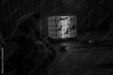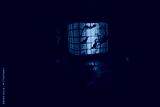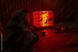 Child in warm clothing looking at glowing red illuminated cube with Halloween spider and bat decorations on wooden terrace, soft night light creating moody seasonal atmosphere and visual contrast