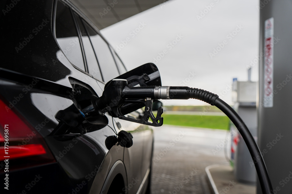 Black car at gas station during refueling process highlighting energy industry, fuel distribution network, and mobility service technology supporting vehicle operation and travel demand