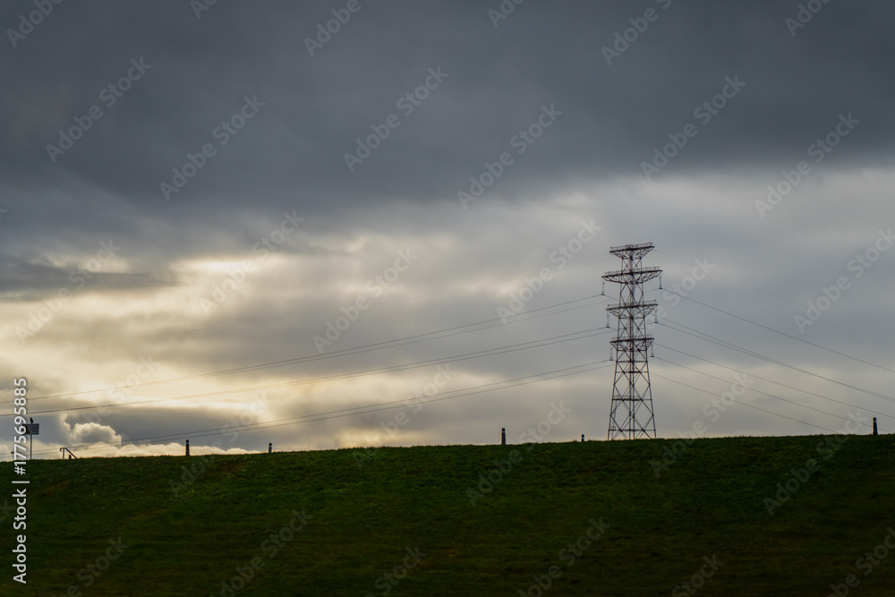 Electric power transmission tower standing on green hill under dramatic cloudy sky illustrating energy distribution infrastructure, renewable connection, and modern electricity network concept