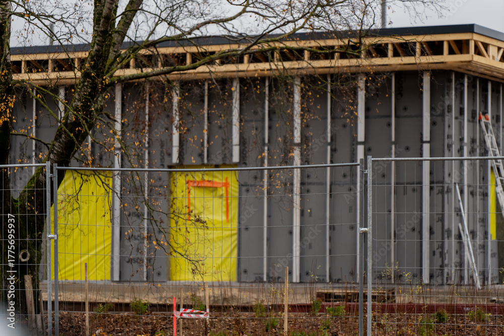 Exterior wall insulation and wooden roof structure on unfinished building within fenced construction zone symbolizing architectural engineering, thermal protection, and modern infrastructure work