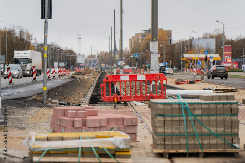 Urban street reconstruction site with paving materials, red safety barriers, and tram line infrastructure under development showing municipal engineering, city improvement, and transportation project