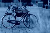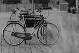 Classic commuter bicycle with chain guard and upright handlebars locked to bench in city square representing everyday urban mobility, sustainable transport, and active lifestyle culture in Europe
