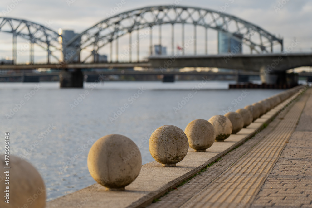 Daugava river promenade in Riga with aligned stone spheres and bridge silhouette representing urban geometry, symmetry, and architectural composition in scenic Baltic capital city environment