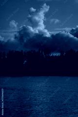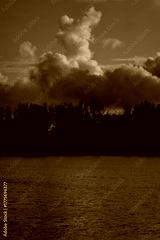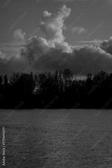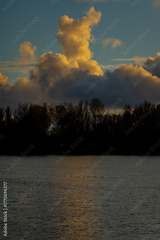 Dramatic vertical clouds above Daugava River and trees in Riga during golden evening hour showing autumn reflection, calm horizon, and soft atmospheric light over water