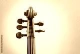 Scroll in the shape of a volute and pegbox of a five-stringed viola, part of the rare musical instrument, front view, light blue gray background with copy space, selected focus