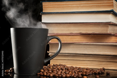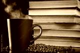 Coffee cup and old books on black