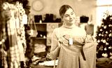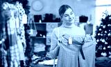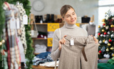 Glad young woman choosing some pantaloons during Christmas sale in clothing shop