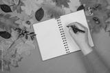 Top view: woman's hand holding a pen and writing in a notebook. An open book and to do list with autumn leaves on an orange background.