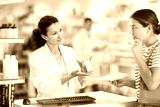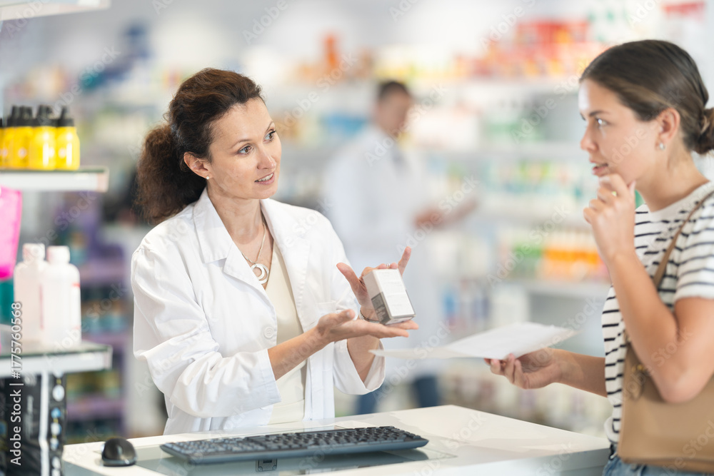 Female pharmacist offering medicine for sore throat to customer