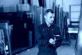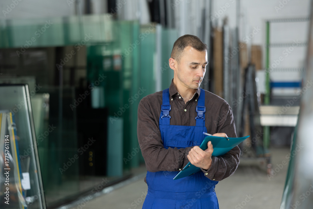 Focused young adult worker in blue overalls inspecting glass panels stacked on support stands and recording quality check results on clipboard in specialized production workshop