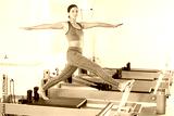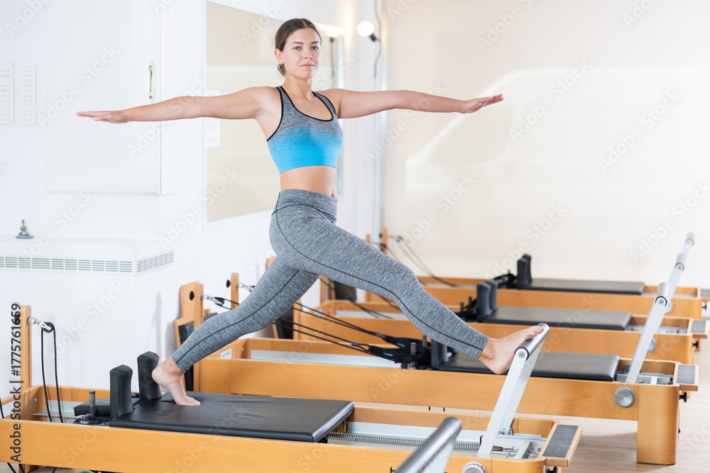 Active young woman doing pilates exercises on pilates workout machines