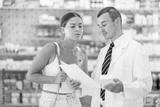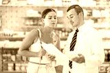 Polite male pharmacist consulting young girl about medicament in box in chemist's shop