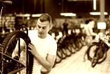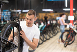 Young male customer choosing bike and checking tire on bicycle wheel in modern sport store