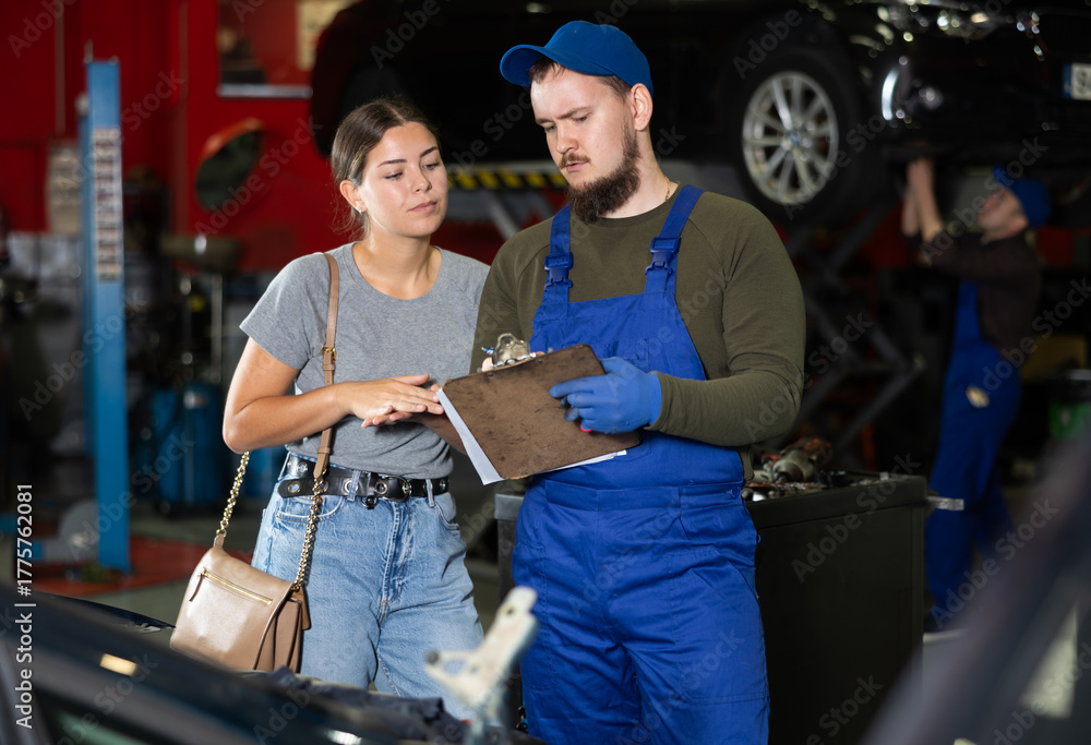 Girl explains the problems of her car to a mechanic. Man writes data on paper