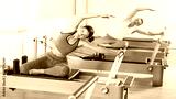 Female athletic woman doing stretching on pilates machine in pilates studio