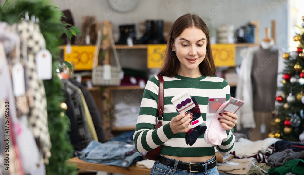 Woman client looks at products in store, looks closely at socks, picks up wardrobe item. Concept of seasonal wardrobe shopping. Young woman enjoys shopping for stylish clothes