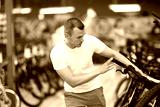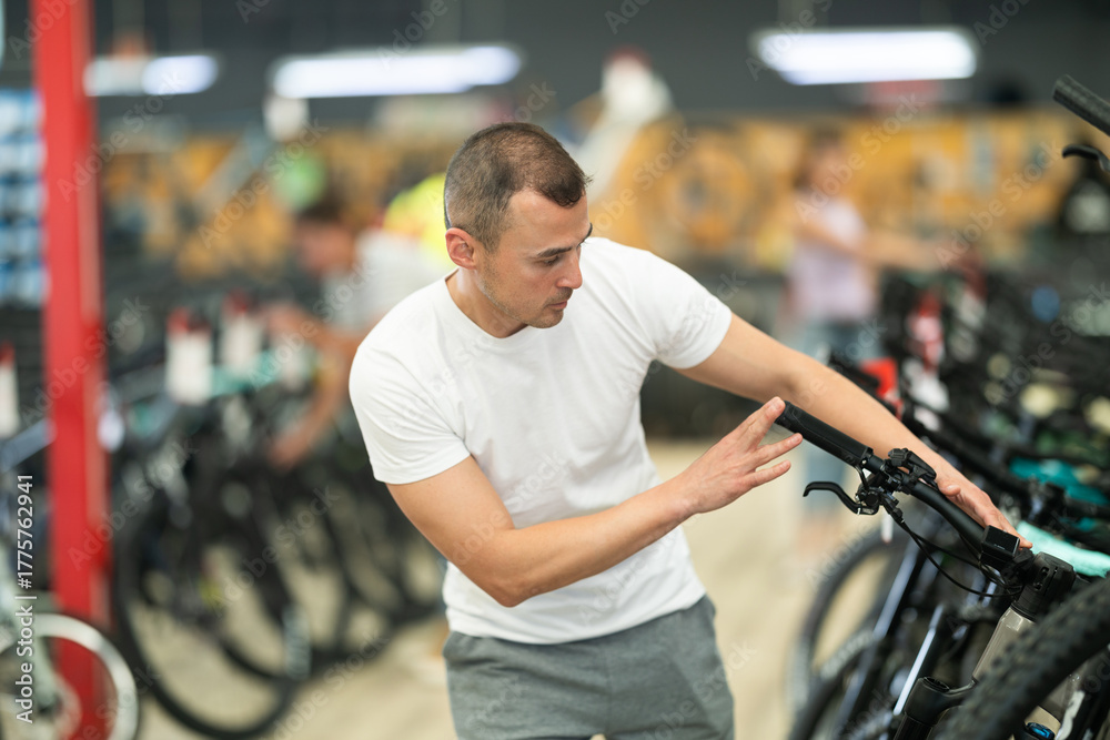 Focused interested sporty young man choosing bike in busy store, examining handlebar system and comparing options..