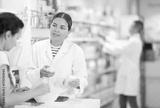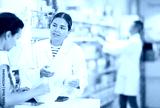 Young female pharmacist giving prescription medicine to adult female buyer at pharmacy