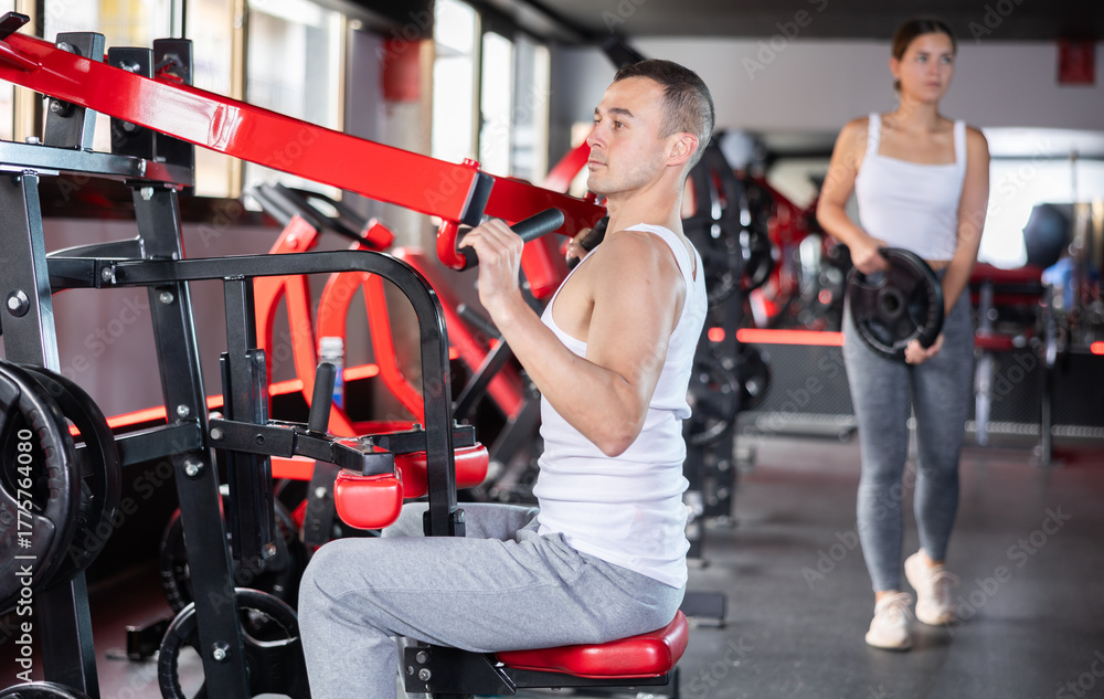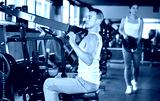 Portrait of adult man doing triceps curls in exercise machine during strength training in gym