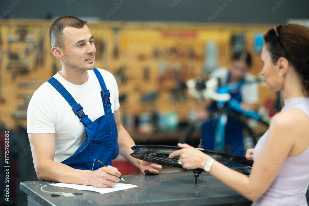 Young experienced man seller taking order and talking with woman client about her bicycle in workshop