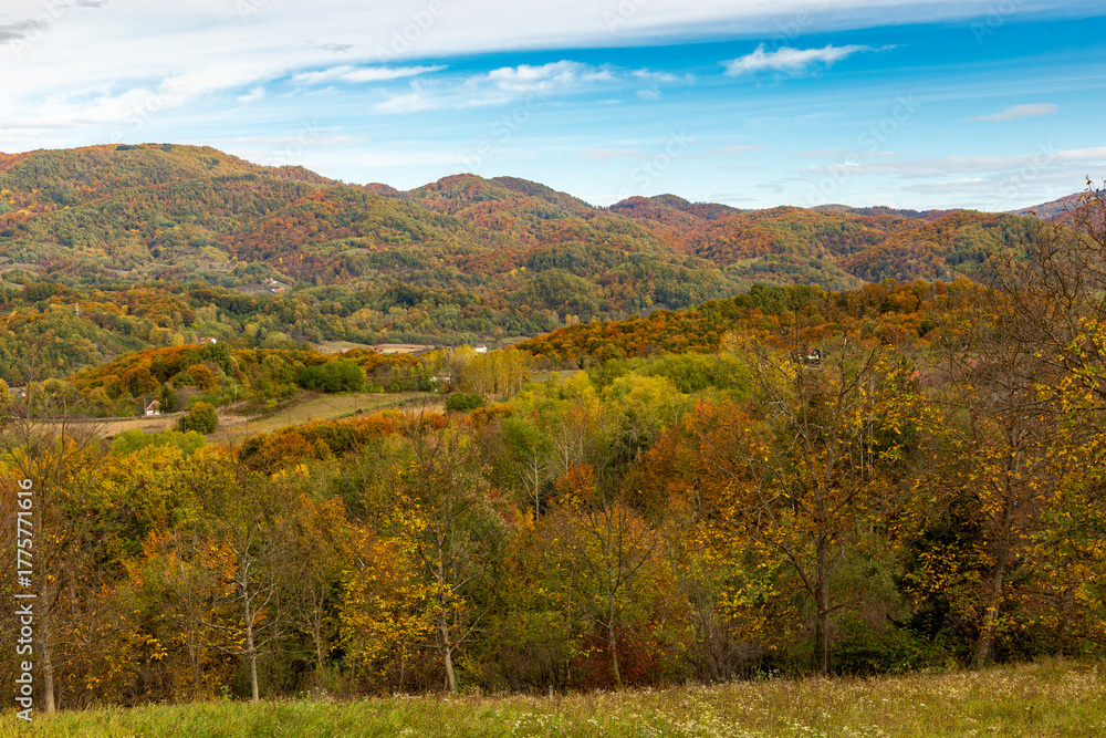 Low forested mountains on an autumn day