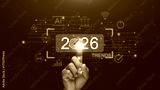 Concept of 2026 business trends. Finger touching at target of 2026 and digital interface with icons of AI, finance, e-commerce, innovation and data analytics. Transformation and global progress.