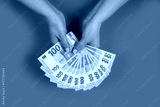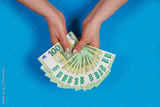 One hundred euro banknotes in a woman's hands. 100 euro bills on a blue background. Bank deposits, financial planning. Business success in the New Year.