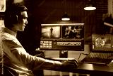 Asian sound and video editor working at apartment desk, reviewing cinematic footage for storytelling projects. Young man having productive editing session with syncing, color grading and sound design.