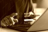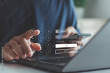 User entering PIN and password on digital login interface using laptop and smartphone, representing secure authentication, online registration and cybersecurity protection for digital identity access.