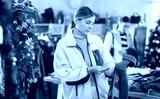 Attentive young lady looking for warm pullover in retail outlet during X-mas sell-out