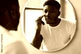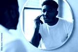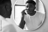 In a bright bathroom, a handsome black man applies moisturizer under his eyes while gazing into a round mirror. He focuses on his skincare routine to enhance his appearance.