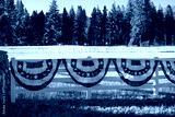 Red, white, and blue patriotic bunting with white stars on the blue section, shaped in semicircles and draped along a fence for Fourth of July decoration. A slice of Americana in a rural area.