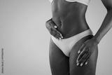 Dark skinned woman in nude underwear gently holds her belly, showcasing her pregnancy against a soft beige background, exuding warmth and joy during this special time.