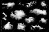 Collection of white cloud shapes isolated on a black background, perfect for sky design, photo editing, weather, fantasy scenes, and creative digital artwork in high resolution.