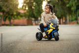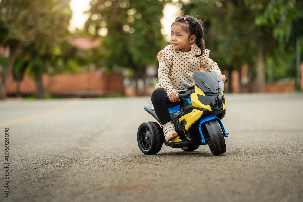 toddler girl riding an electric motorcycle toy in park with sunlight