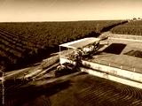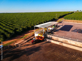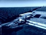 Aerial view of a large coffee farm in Brazil, showing the bean drying process on a patio with modern machinery and vast green plantations in Brazil