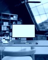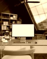 White screen computer and coffee on wooden working table and chair across roof window in attic room.