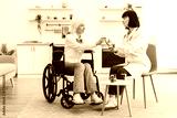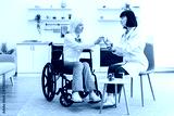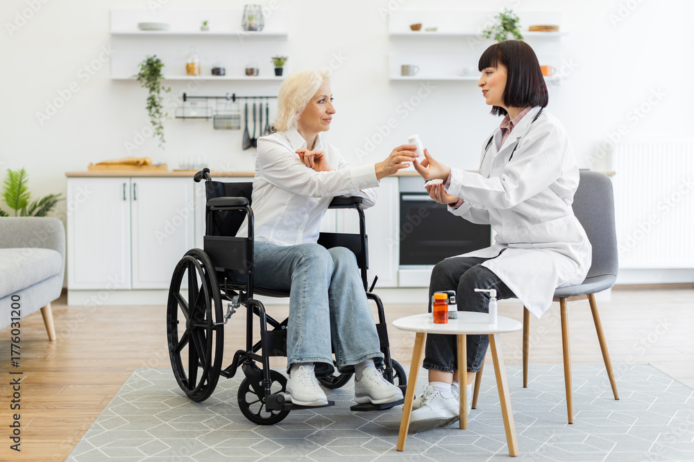 A female doctor is giving medication to an elderly woman in a wheelchair, discussing treatment in a home setting.