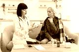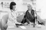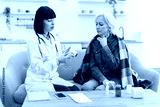 A female doctor is checking an elderly patient's temperature using a digital thermometer while the patient sits on a couch.