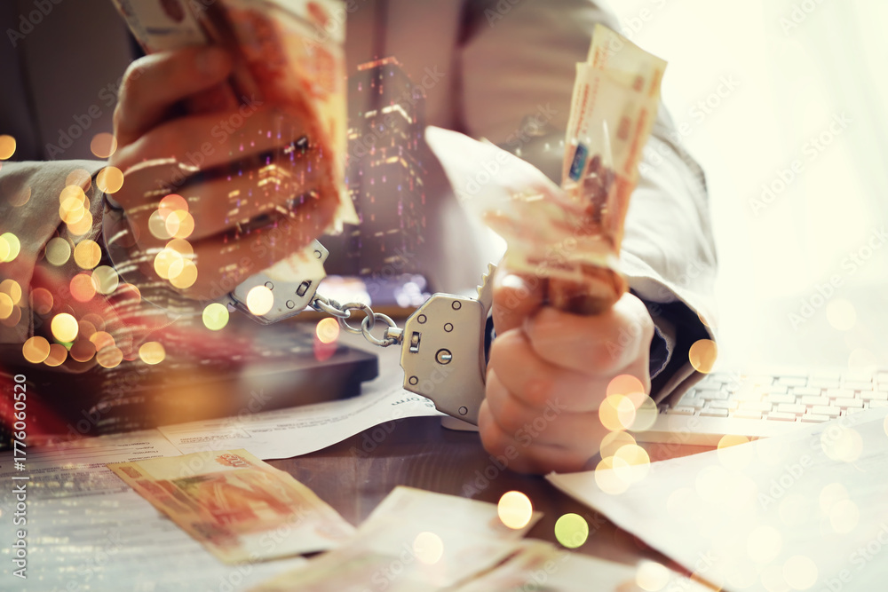 Double exposure of male hands locked in handcuffs city landscape background. Hands in handcuffs behind, holding five thousand rubles.
