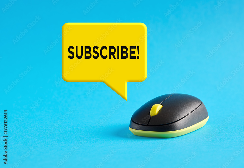Wireless computer mouse inviting to subscribe on blue background