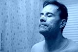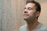 Man in the bathroom wearing anti snoring nasal strip breathing aid for better sleep quality.