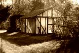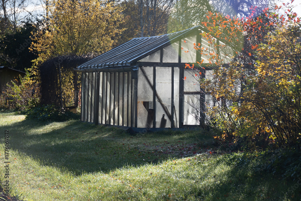 sunlit greenhouses in the morning light, autumn flowers affected by morning frost, allotment garden concept