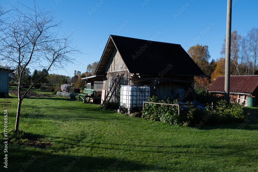 sunlit greenhouses in the morning light, autumn flowers affected by morning frost, allotment garden concept