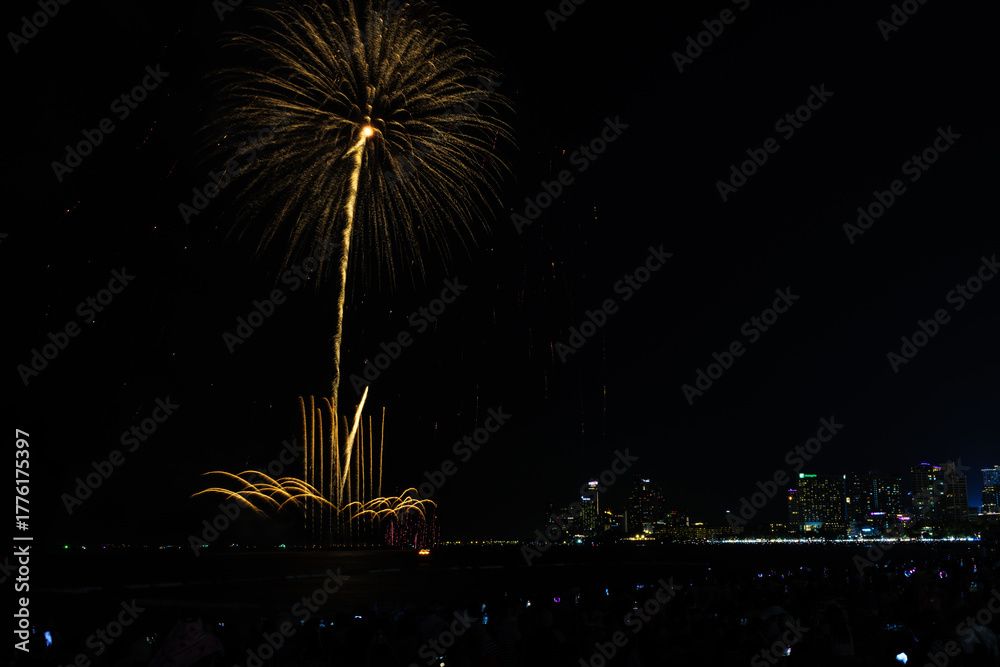 PATTAYA, CHONBURI, THAILAND Beautiful colorful fireworks night scene shot at Pattaya International Fireworks Festival and silhouette Group of people tourist shoot and record firework show,