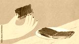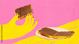 Minimalist pop art collage. Yellow hands holding chocolate spread toast on pink background. Concept of breakfast simplicity, sweet snack design, food styling, and modern visual illustration.
