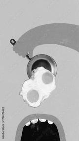 Modern composition. Blue hand holding pan with fried eggs on orange background. Concept of breakfast cooking, morning energy, culinary design, and contemporary food composition.