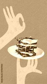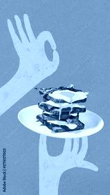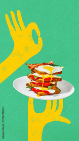 Pop art bright poster. Yellow hands holding plate with toast stack eggs bacon and tomato. Concept of breakfast serving, balanced nutrition, culinary harmony, and modern food illustration.