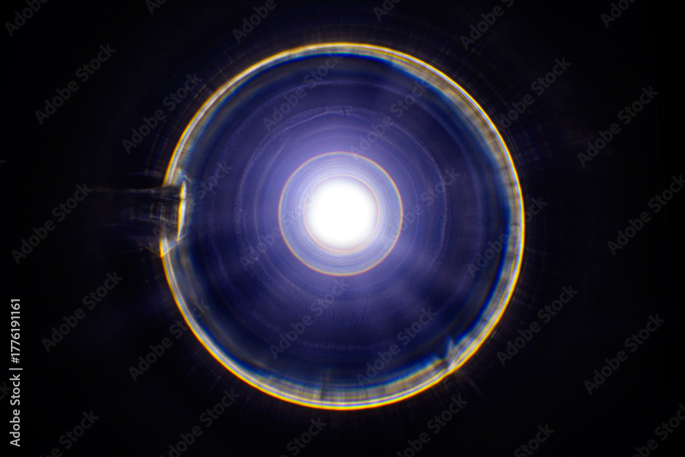 a circular light source with a bright white center, surrounded by concentric rings of rainbow light. The light rings appear slightly blurred, giving a dynamic, almost swirling effect