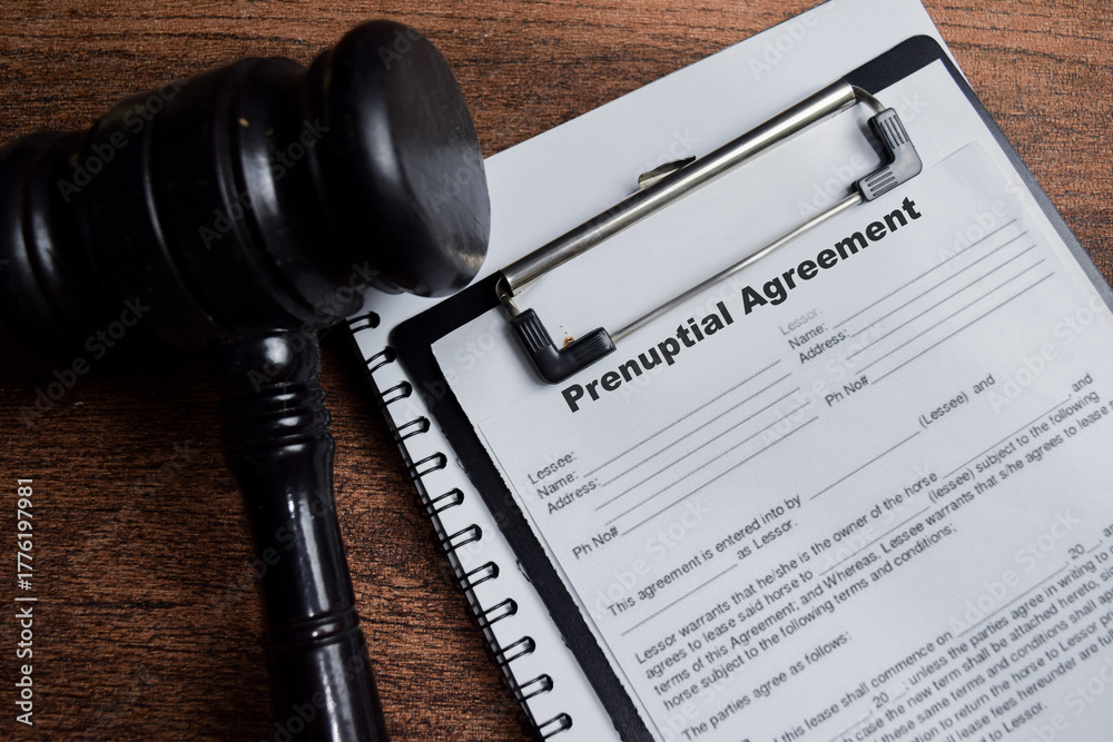 Concept of prenuptial agreement contract write on clipboard isolated on Wooden Table.